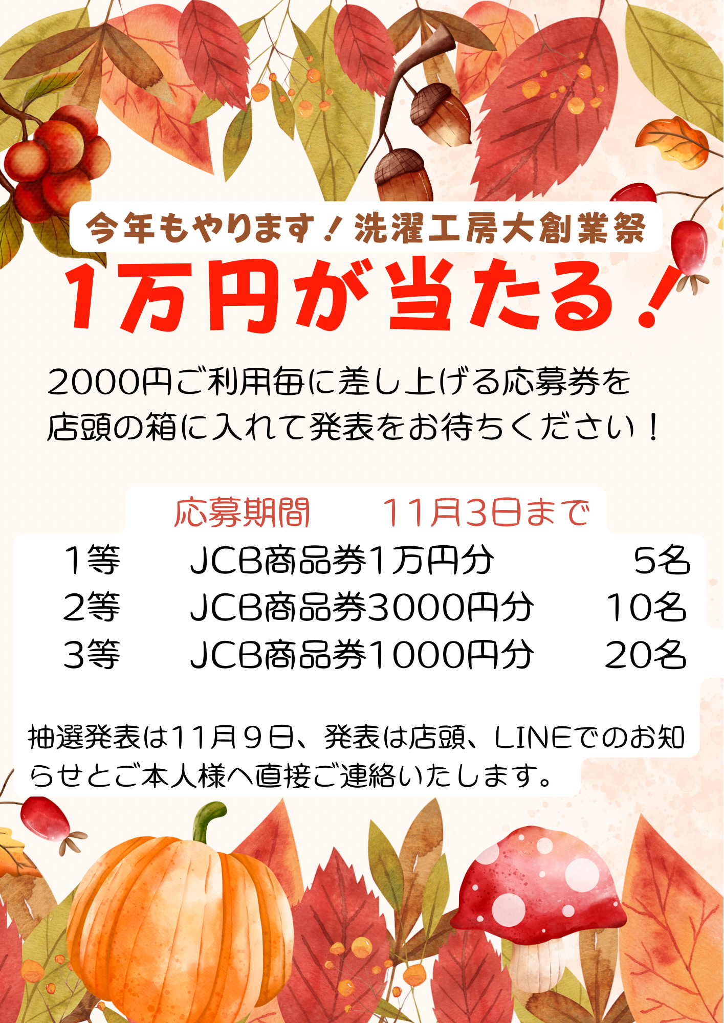 2025年9月20日 / 最終更新日 : 2025年9月20日 洗濯工房 プレゼント企画 1万円が当たる創業祭始まりま〜す! お陰様で長与本店開業から32年 感謝の気持ちを込めて… 今年も楽しく開催します!大創業! 2000円ご利用毎に応募券1枚を差し上げます。お名前、お電話番号を記載の上店頭の応募箱に入れて下さい。 発表は11月9日(日) 当 […]